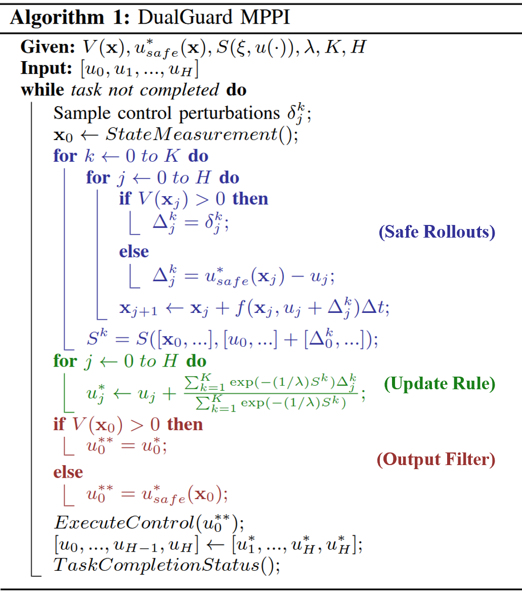 The full DualGuard MPPI algorithm combines both filtering layers into a provably safe and performant control strategy: