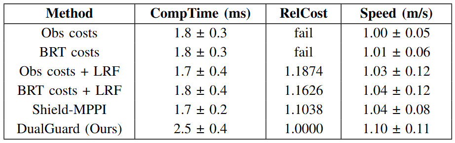 To reflect real-time performance, we report: Computation Time (ms per control update), Speed (average m/s over three laps), and RelCost (normalized performance cost). Safety-violating episodes are marked as failures. The cost function penalizes deviation from track center, lower speeds, and safety violations: