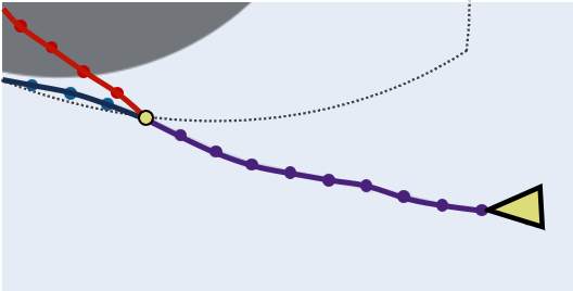 This procedure is repeated at every time step. The figure below visualizes the forward-simulated rollouts from sampled noisy control sequences. High-cost (unsafe) rollouts are shown in red, while lower-cost (safer) ones are shown in blue.